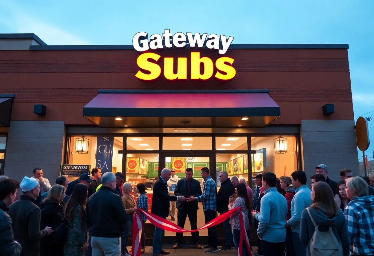 A vibrant scene of the Gateway Subs grand opening event with a ribbon cutting and community members.